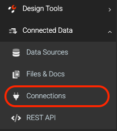 To add connections for either Box - Data Source Connector or Box - Form Connector, you first need to navigate to the Connections area of the platform. You can do this by using the side menu to go to Connected Data > Connections.