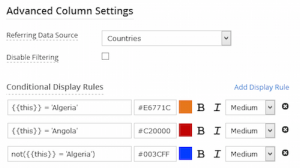 This opens up a new level of display customization for Data Source row values. You can define rules that make column values appear in different colors and text styles based on a formula result. For example, you might have a Status column that has three possible values – Good, Bad and Ugly. Defining rules for these will let you display those Status values in different colors to emphasize their meanings. These rules can be leveraged on your app in the following areas: