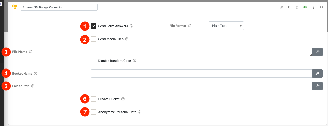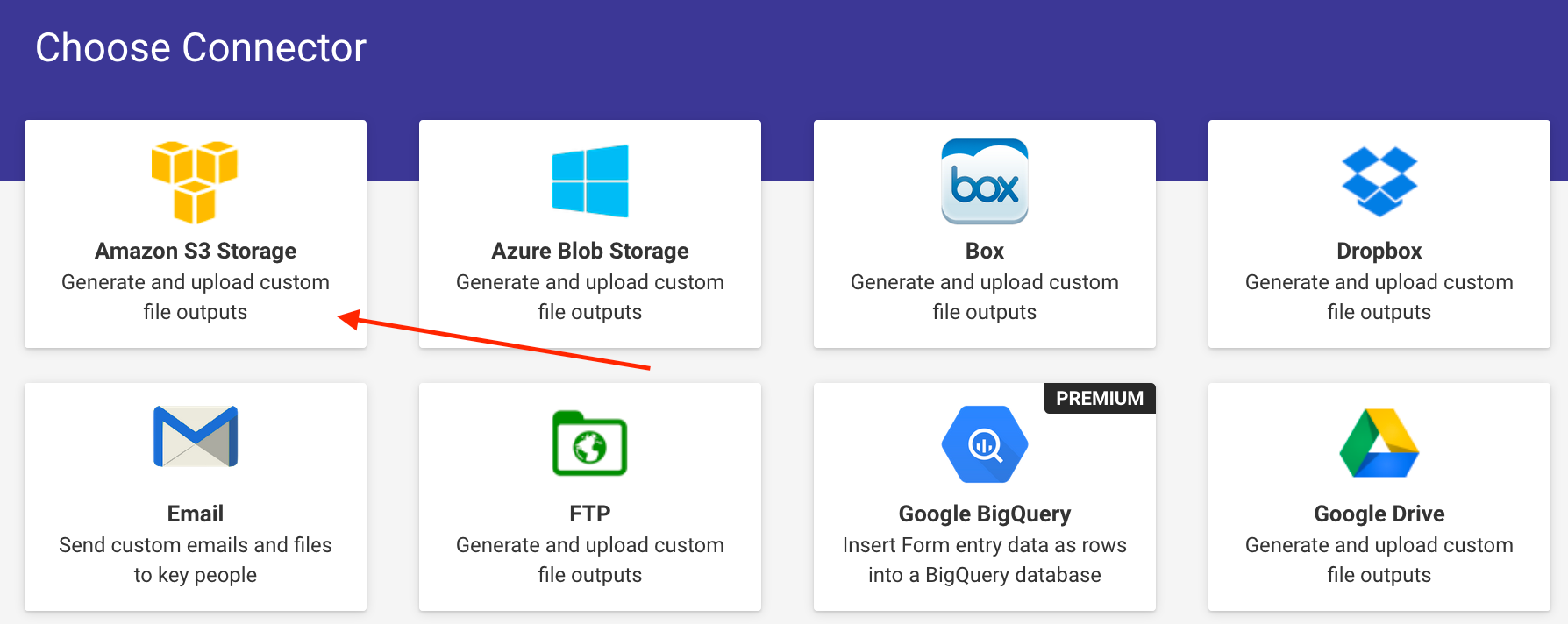 On the Form -> Connectors page, click the Add button to add a new connector. Then click on the Amazon S3 option.