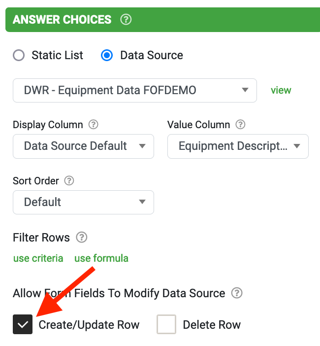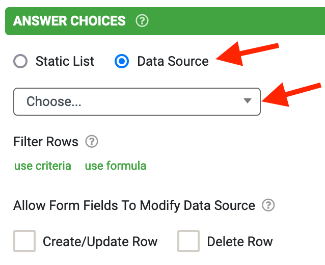 Whether you're using a Choices Field Type or Data field within your form design to link a data source and use its data, creating, reading, and updating rows, or deleting a row, applies to both.