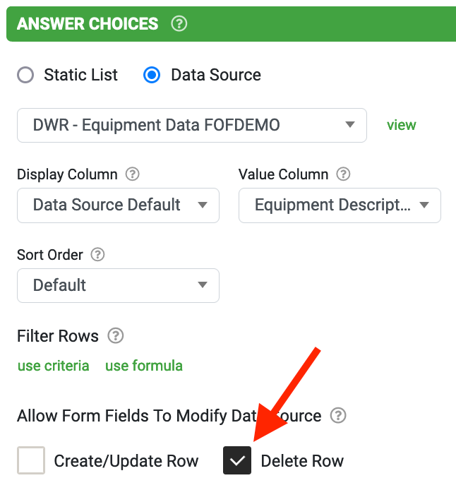 And binding a field to the initial or unique identifying row's column telling the platform which row to delete. This field can be a Hidden field but is required, other than the Choices field selection or Data field filtering by user-captured data.