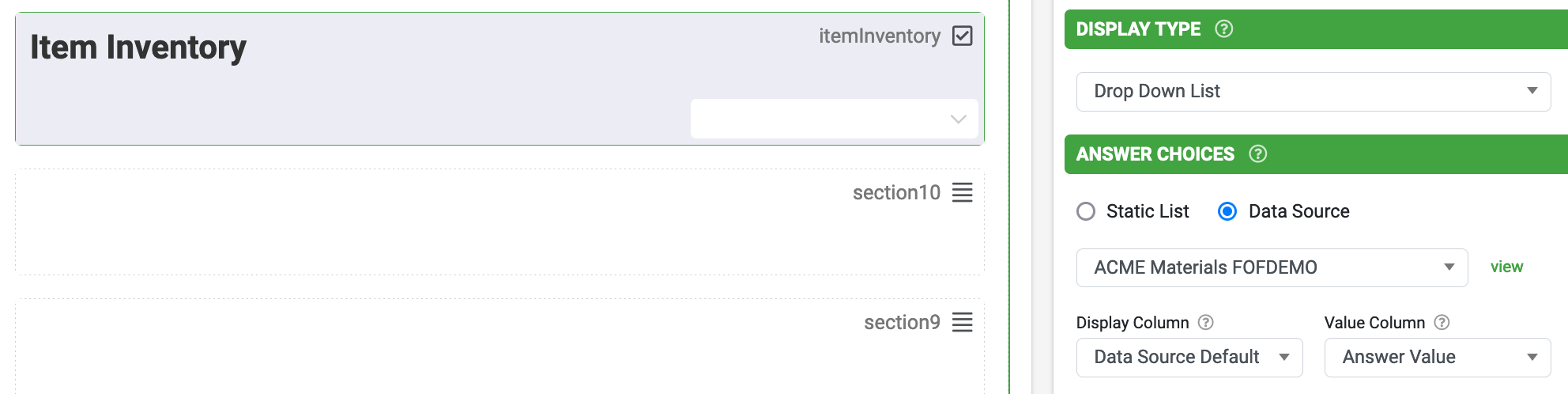 For example, linking a Choices field to a data source to display a list of item names in-app for selection.
