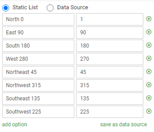 First, create another Choices field {{Heading}} with these static choices; this will serve to choose the direction of the street-level view: