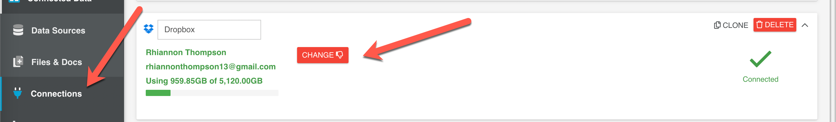 - Head over to the Platform's Connections page, find your Dropbox connection(s) and click on the “Change” button.