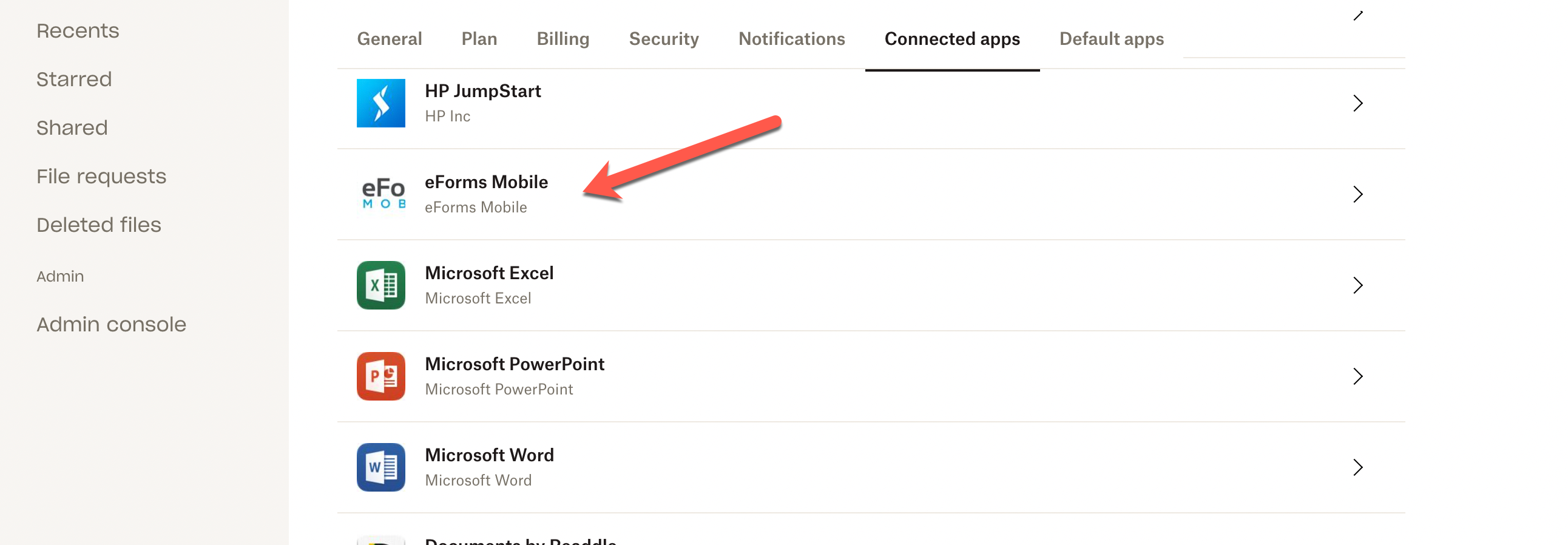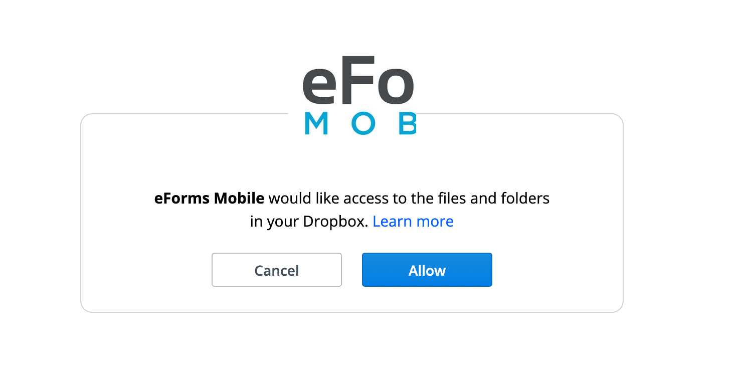 - In this window, scroll down to “View Dropbox content”, and then to the “eForms Mobile” app.