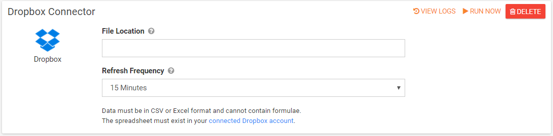 Enter the file location on Dropbox to import data from. The location should be entered in the following format: 'FolderName/Folder2/FileName.csv'. The following file types can be imported as a Data Source: Comma Separate Values (.csv), Microsoft Excel (.xlsx). - Refresh Frequency