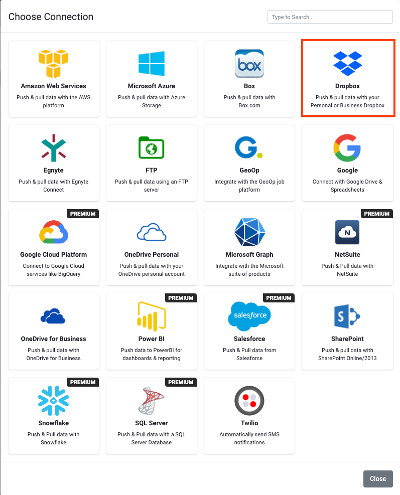 Our platform enables you to quickly and easily connect your data sources to data from a file in both Dropbox Personal as well as Dropbox for Business.