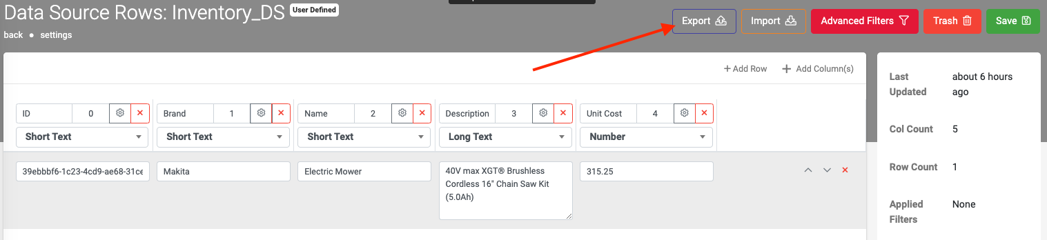 - Click the EXPORT button in the top-right corner and the Export Data Source Rows to File pop-up window.