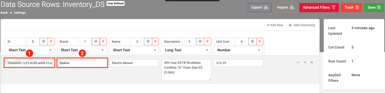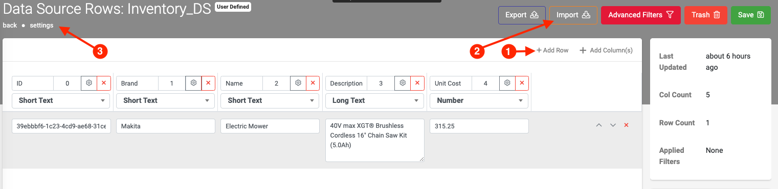 To add rows to a Data Source, you can either upload a CSV-formatted spreadsheet or a standard Excel spreadsheet or else manually add items using the Add Row link. NOTE that for data to be entered into the data source, it is highly recommended to ...