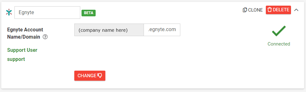 After saving, an ‘AUTHORIZE’ button will appear on the Connection. Selecting this will launch a popup-window allowing you to enter your Egnyte Connect login details and authenticate the Connection. A successful connection will be indicated by a Connected green check mark to the right of the Connection.