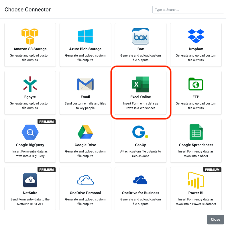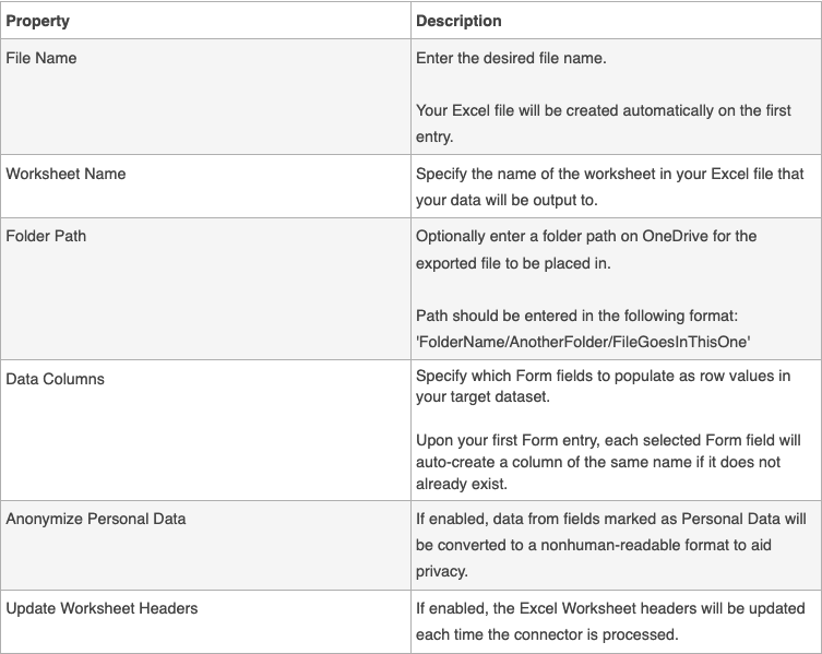 The Excel Online form connector allows for form-captured data to be pushed as rows into an Excel worksheet, similar to how our Google Spreadsheet form connector functions.