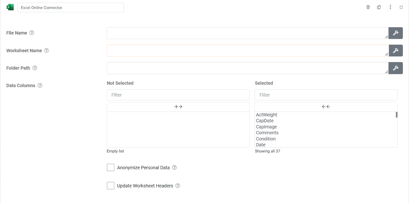 After Selecting the Excel Online Option, the page will refresh with your newly added connector ready to configure.