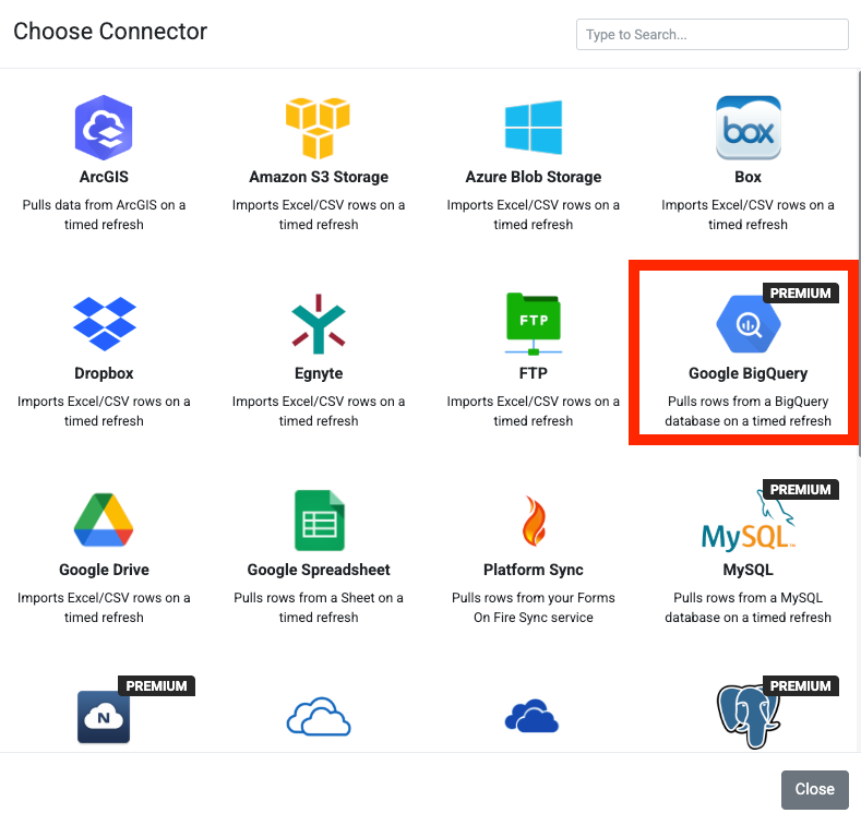 This is a Premium connector for direct connection to Google's BigQuery database service. Our platform enables you to quickly and easily insert your Form Entries as rows in a target BigQuery database table. This enables a one-way synchronization to ...