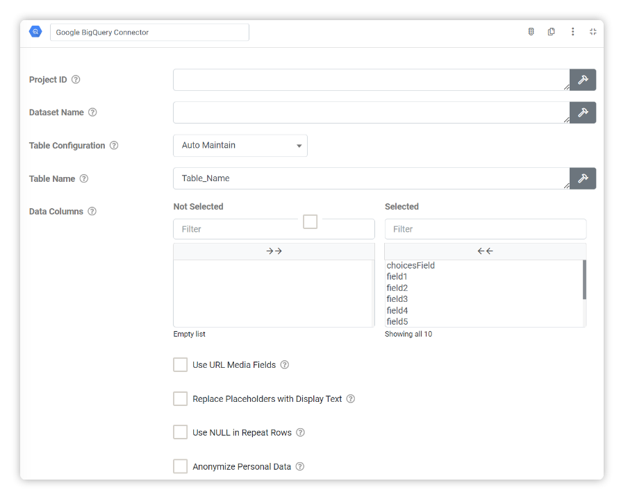 | NOTE: The Google BigQuery connector does not support adding additional columns to a table once the table has been created. We get around this limitation by appending the form version suffix to the table name. If you however, make changes to the connector or fomr design such that new fields are mapped to the new columns, subsquent runs of the connector will fail while still in test mode. To fix this, either delete the table in Google BigQuery so that the next run of the connector recreates it, or simply publish the form design so that _v* suffix is used. |