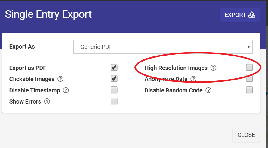 When exporting a Form entry (through our Data Entries area on the web portal), you will notice we provide a "High Resolutions Images" checkbox. Selecting this option will increase the image sizes in the PDF from our default of 96ppi to 150ppi (pixels per inch).