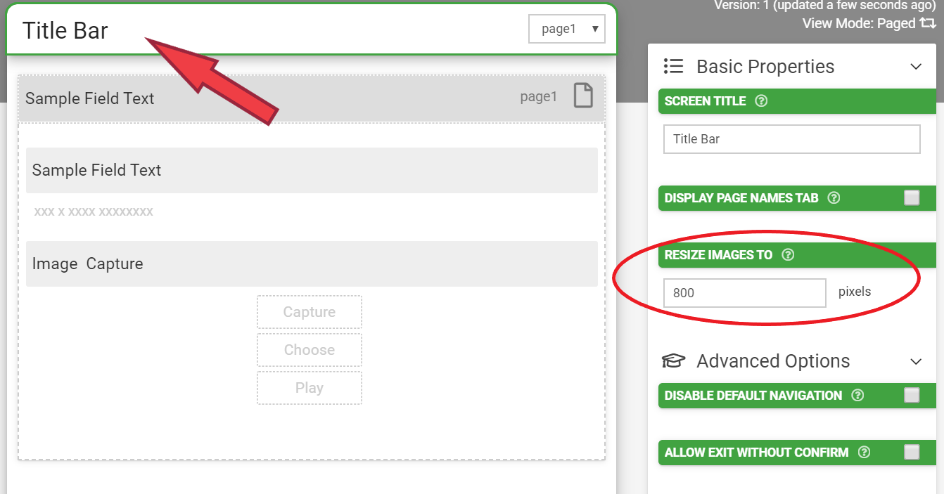 Images that are captured via Media fields in your Form will be automatically resized to a maximum height/width of 800 pixels. This default ensures that captured images do not consume large amounts of the user's mobile data during uploads and maintain reasonable quality for printing and PDF outputs. If you wish to change this default behavior, you can do so at the individual Form level via the "RESIZE IMAGES TO" designer setting. In the web portal, browse to your Form design and click on the title bar of your Form preview to access this option.