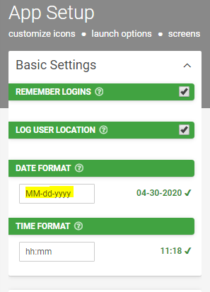 By default, the date format shown on the online platform and to app users in the American format, "MM-dd-yyyy." This can be changed by editing the contents of the "Date Format" region within Apps > App Setup.