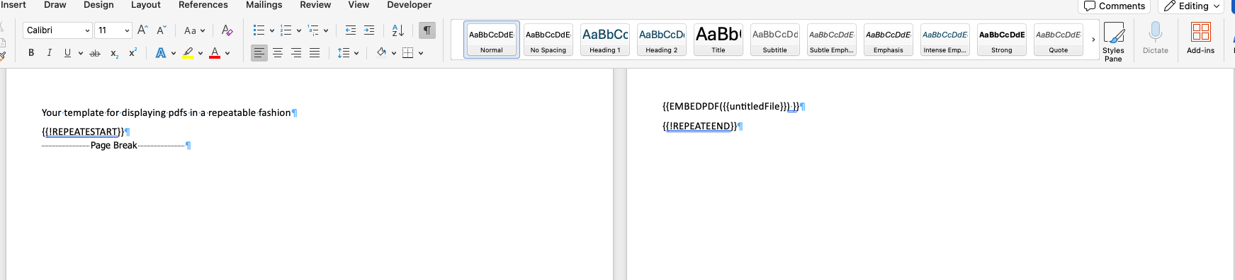 - When creating your Word/Excel data template, the EMBEDPDF() function should be placed separately on its own blank page. The PDF's content will replace the blank page.