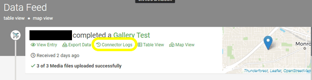 In the Data Feed view, identify the desired form submission and click Connector Logs as shown below:
