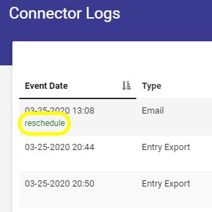 At this point the Connector Logs window will be displayed. From here, hover over the Event Date of the desired connector. The link “reschedule” will then be displayed. Clicking this will resend the submitted form over the associated connector to all parties/locations specified in said connector. In the example pictured below, this would be for the Email connector. Perform this same step for any other connectors as desired.