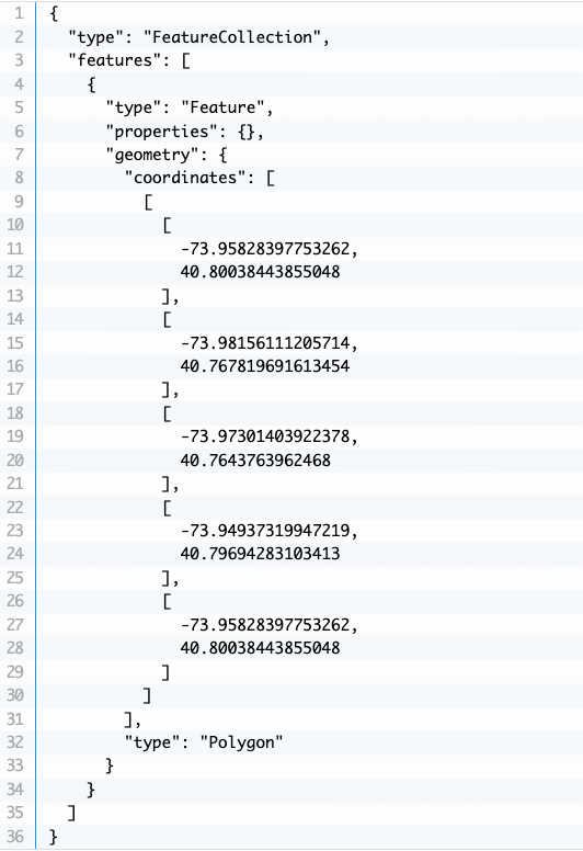 Below is a sample GeoJSON body containing coordinates for the perimeter of Central Park, New York.