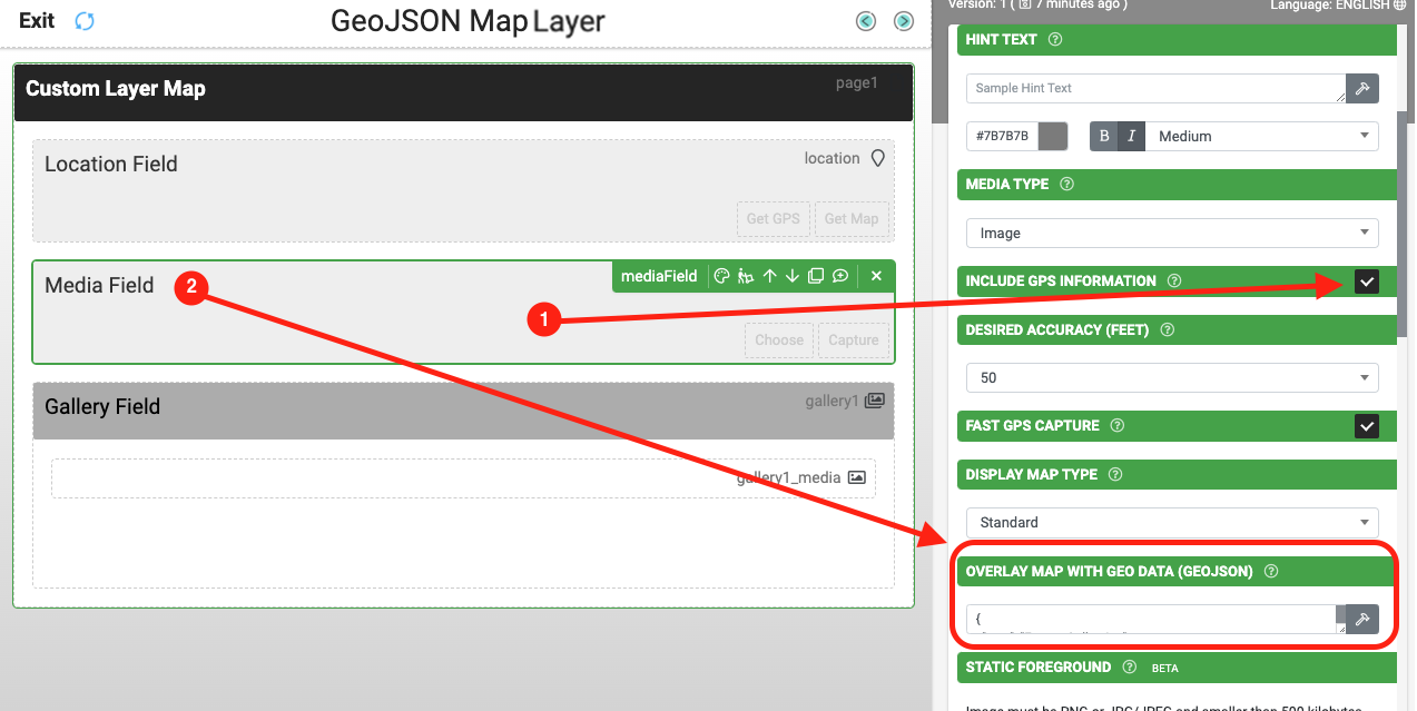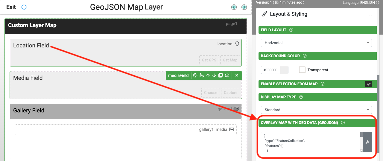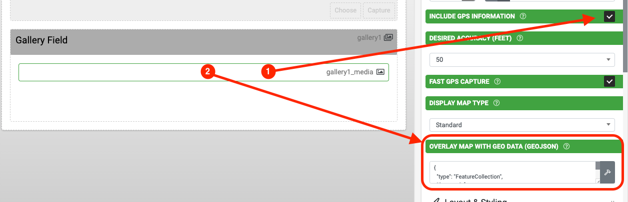 Under the field's Basic Properties, if the Include GPS Information is checked, the Overlay Map with Geo Data can be populated with GeoJSON data for the field to use.