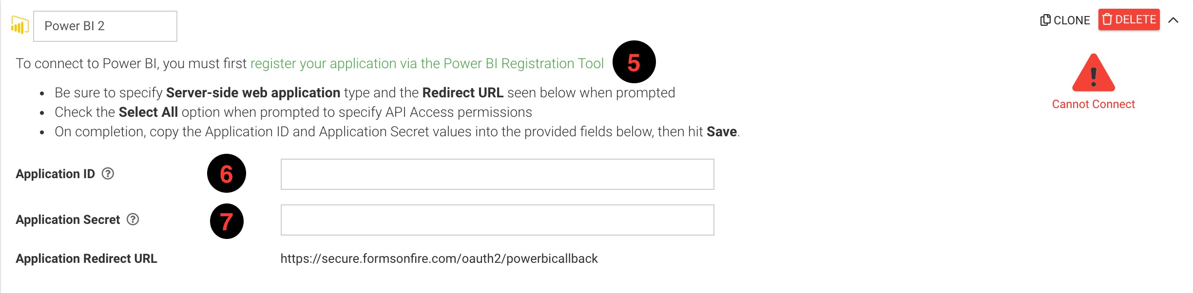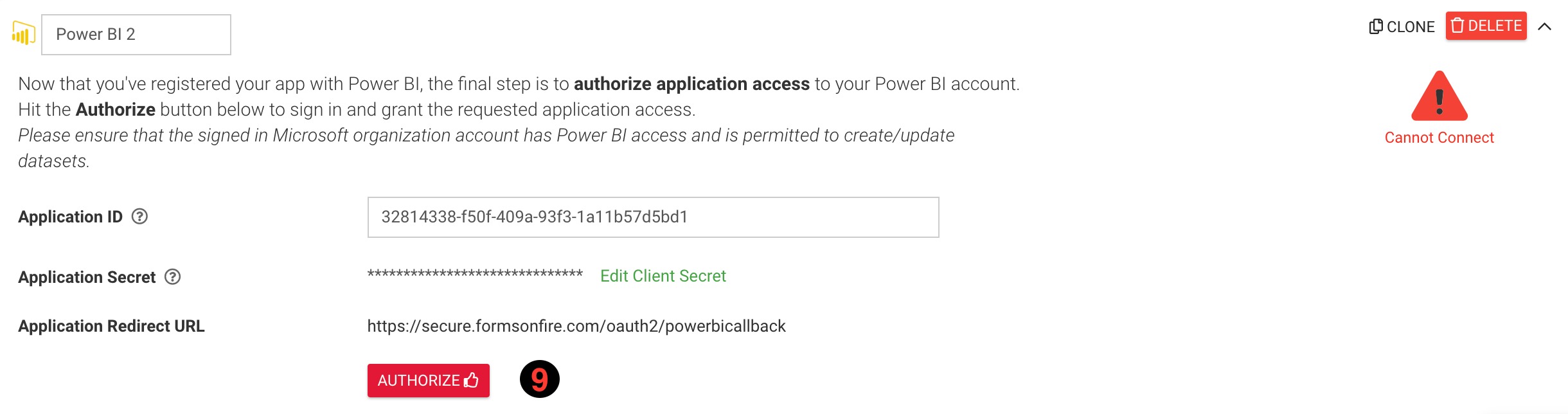 Next, you'll need your Power BI Application ID6 and Application Secret7 to proceed. This can be obtained by following this guide5: