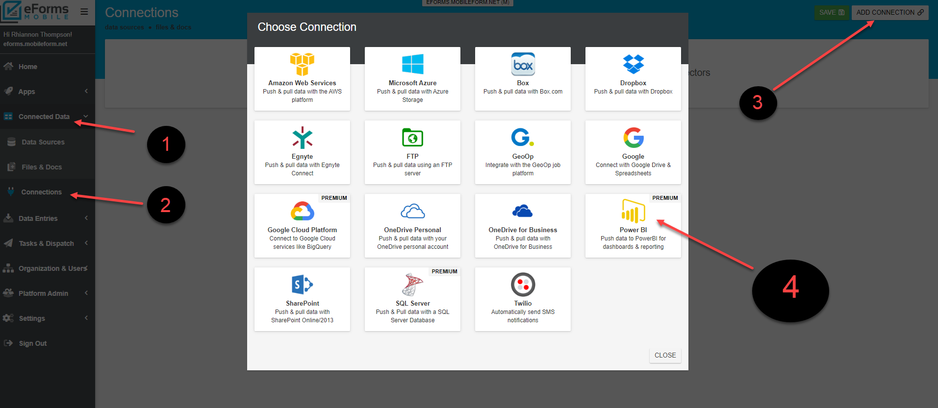 Click "Add Connection"3 in the top-right corner of the screen and select "Power BI"4
