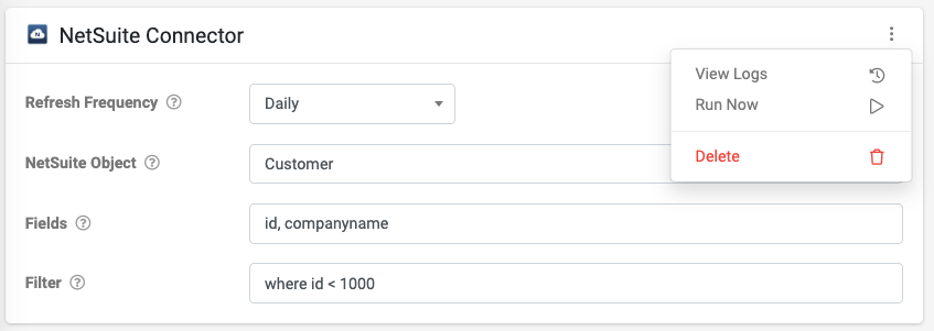 If rows are not downloaded, then there may be an error with the connection to NetSuite. You can also check errors by clicking on the kebab menu to View Logs for more information.