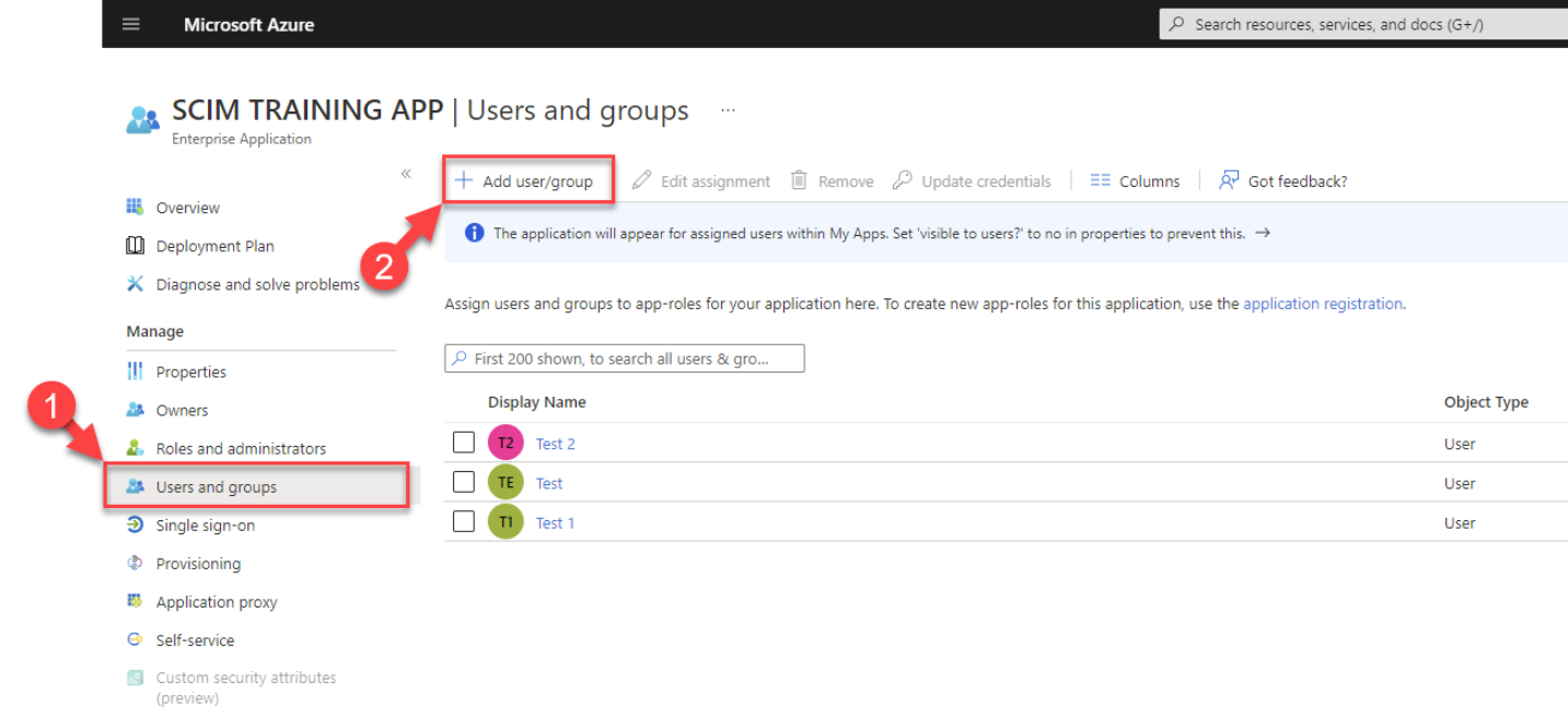 When viewing the application, select Users and Groups, and Add users to assign to the app that will be provisioned through to our platform.