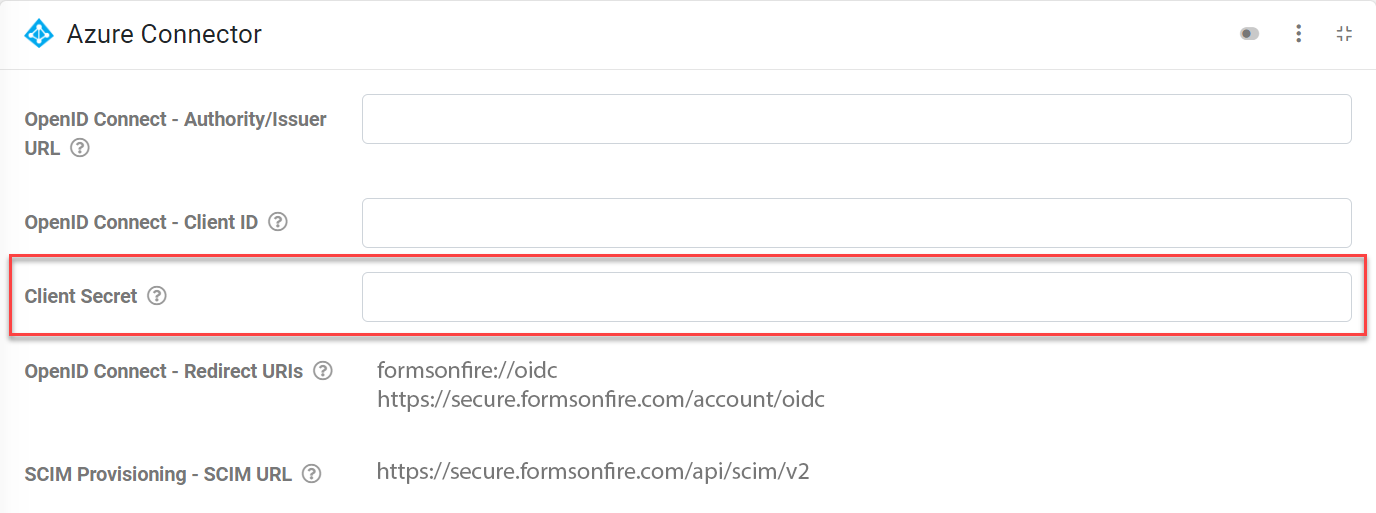 Then copy the Tenant/SCIM URL and Secret Token/Password from your account's Organization Setup > Integrations page, under External User Authentication And Provisioning, Azure Connector.