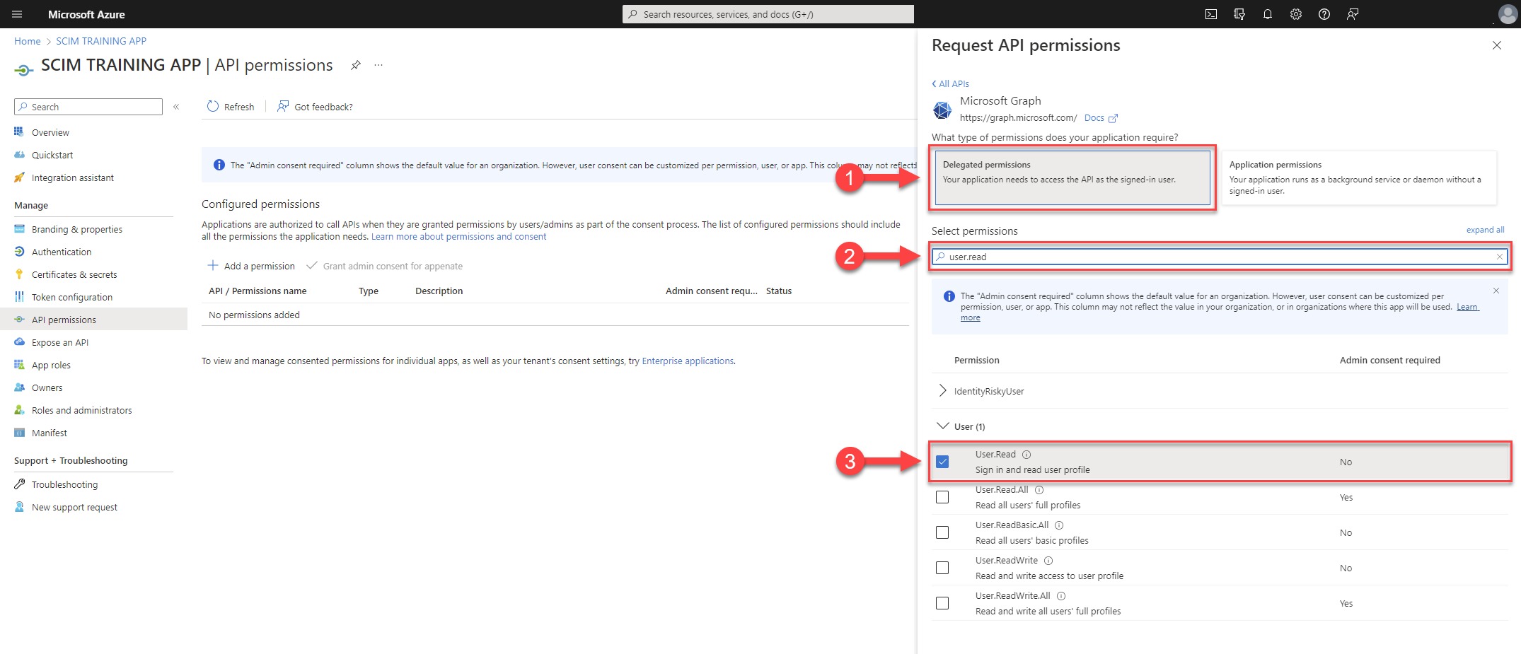 Delegated permissions and then search ad tick the Selected permissions User.Read.