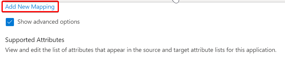 You now need to add a new mapping for the attribute you just created. Click on Add New Mapping on the page that you are returned to. The link is just above the Show advanced options that you clicked previously.