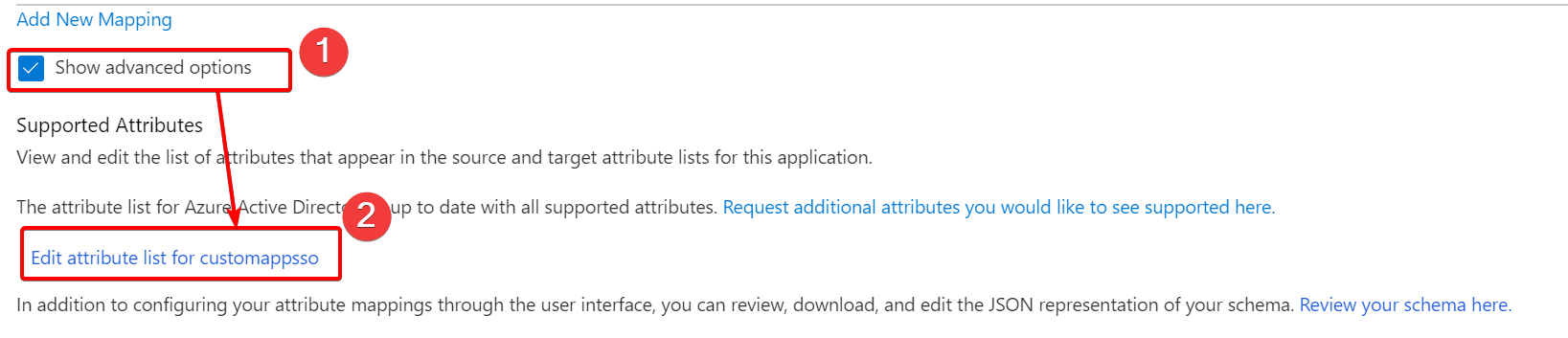 Below the list of mappings, click the link Show advanced options. This will then display a previously hidden section which will have a link Edit attribute list for {{Your applications' name}}. Click this link. In the screenshot below our applications' name is "customappsso".