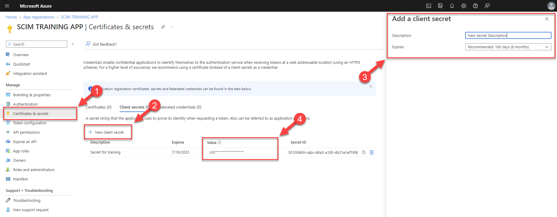 While registering the app, navigate to Certificate and Secrets, and add a new client secret to obtain the Secret's Value/Client Secret. When creating a new secret, the secret's value is what's needed, so be sure to copy and paste it immediately into the Azure Connector or save it for future use.
