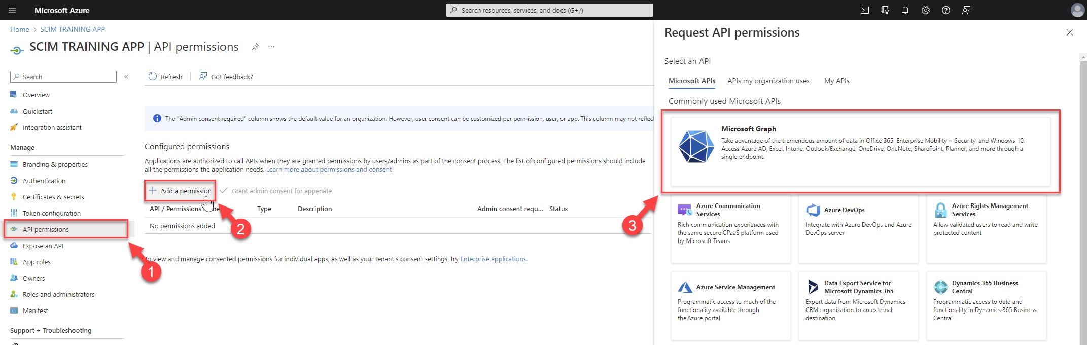 Now, let's add permissions. On the API permissions page, click on the Add a permission option, then select the Microsoft Graph section.