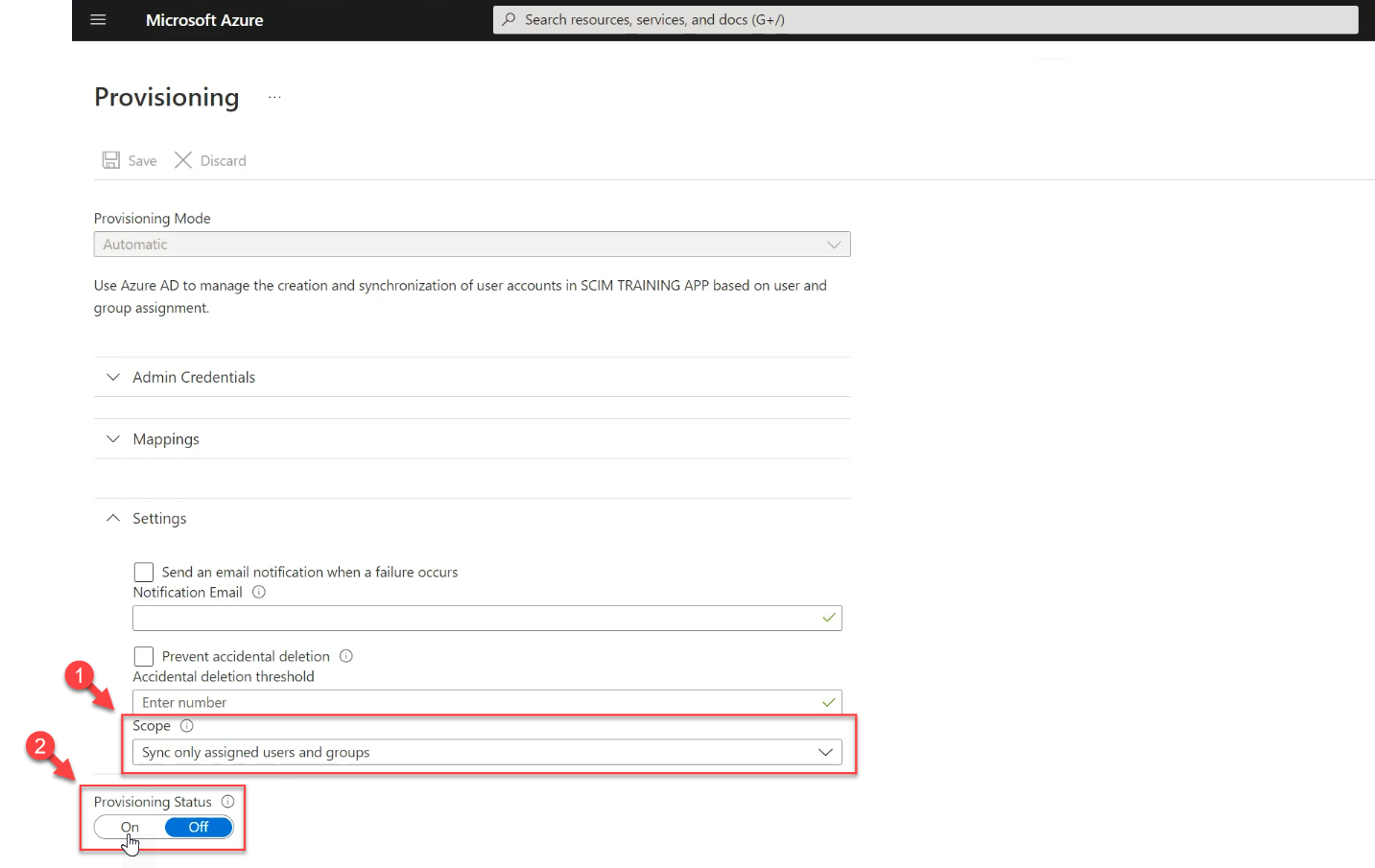 4. Finally, when viewing the application, select Provisioning to set the scope and status.