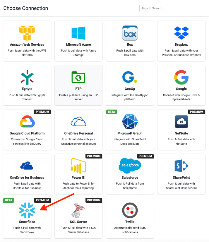 - A new window with connectors to choose from will appear, click the Snowflake option.