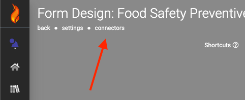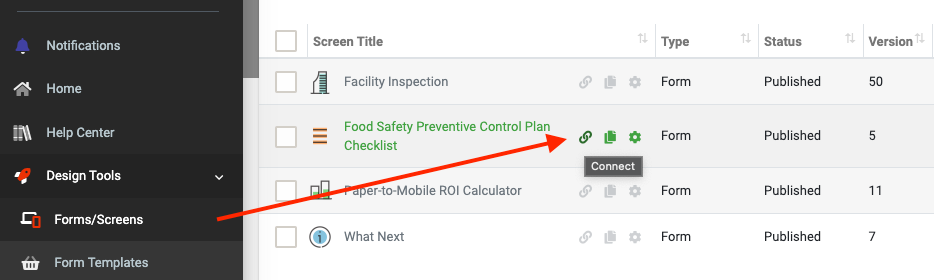 Form Connectors can be added to push data to other systems on the Form Connector's area of any Data Entry Form. Navigate the side menu to Apps > Screens and hover over the Connect option of the desired form.