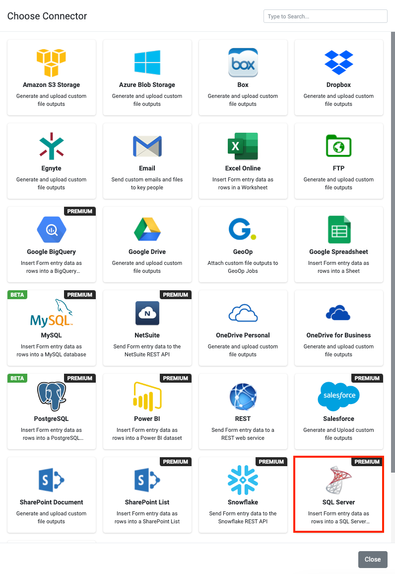 A Premium connector for direct connection to Microsoft SQL Server. Our platform enables you to quickly and easily connect your Form Entries to a SQL Server database. This enables a one-way synchronization to occur - where any Form Entries are pushed to tables in a SQL database.