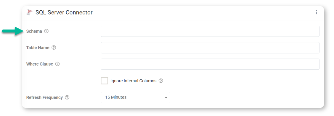 After adding the Data Source Connector, configure the connector. Enter an optional schema, the table name to retrieve rows from, or an optional clause to return specific rows.