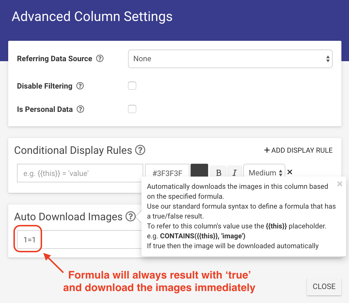 - Within the Advanced Column Settings dialog box that pops up, type "1=1" in the Auto Download Images field
