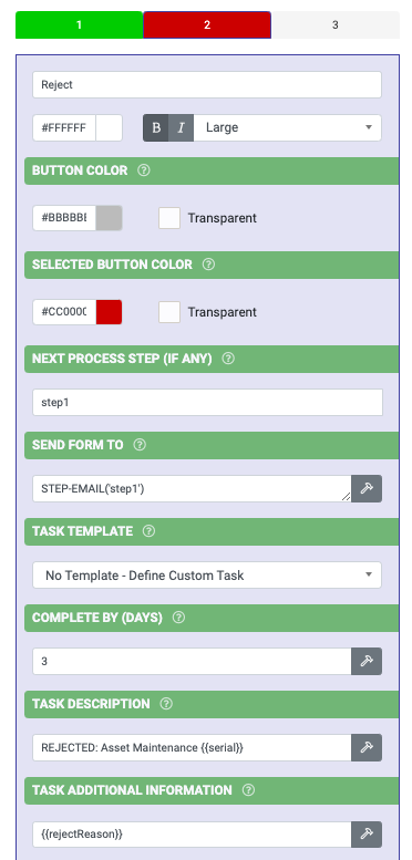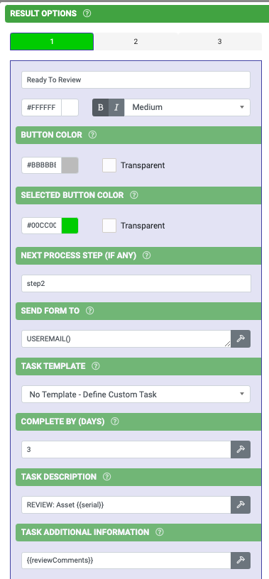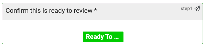 1. Open the Asset Check Process design in the Form Designer. You will see the "Confirm ready to review" Process Step field (dataname: step1). Note also the fields named "Send to Reviewer" (dataname: reviewTo) and "Any comments..." (dataname: reviewComments):