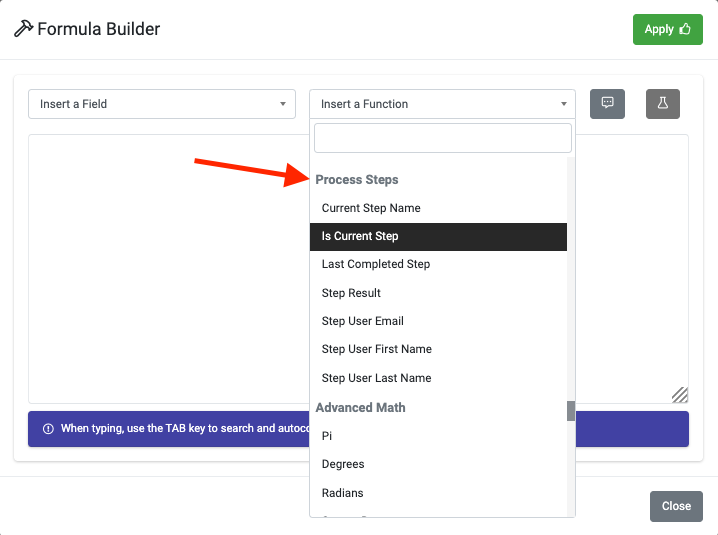 The Visibility properties make use of some of the Process Step-specific formula functions available for you to use. Launch the Formula Builder from a property - i.e., click on the little "hammer" icon that appears next to these properties. If the Formula Builder, you can see these Process Step functions in the functions drop down list. Mouse over each function to see help text about each one: