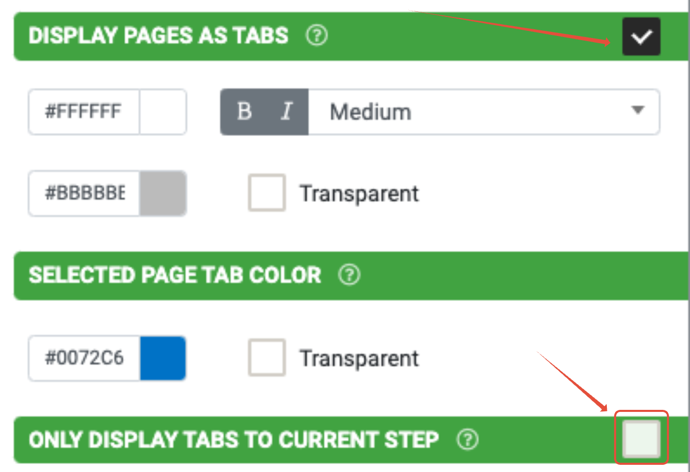As soon as you select "Display Pages as Tabs", you will be able to set the option to "Only Display Tabes to Current Step".